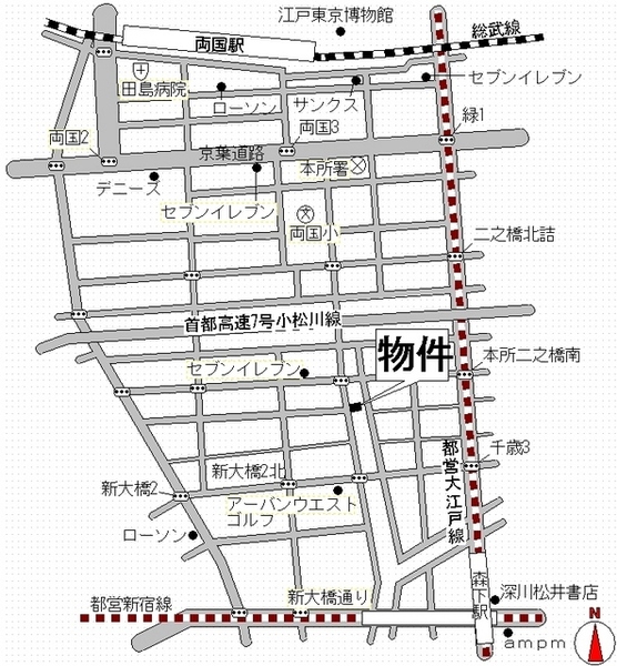 徒歩4分 総武線 『両国駅』 徒歩10分 都営大江戸線 『清澄白河駅』 徒歩14分 |