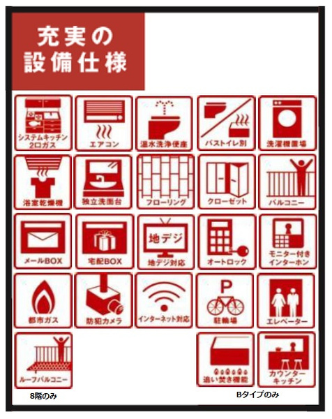 | 設備 | オートロック / カップル向け / 新婚さん向け / 仲介手数料無料 / 室内洗濯機置場 / バルコニー / 都市ガス / 24時間換気システム / 駐輪場 / 敷地内ごみ置き場 / ガスコンロ / コンロ2口以上 / システムキッチン / 対面式キッチン / バス・トイレ別 / 追焚機能浴室 / 浴室乾燥機 / 温水洗浄便座 / 洗面台 / 独立洗面台 / エアコン / シューズボックス / インターネット無料 / TVモニタ付インターホン / 宅配ボックス | ||