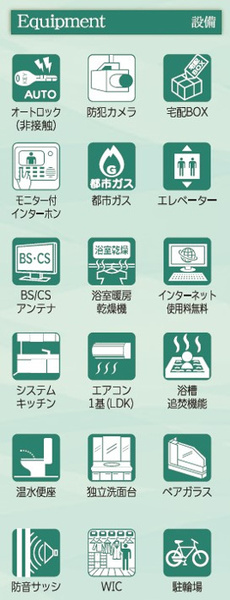 | 設備 | 防犯カメラ / オートロック / 24時間ゴミ置場利用可 / 保証人不要 / カップル向け / 新婚さん向け / 室内洗濯機置場 / バルコニー / 24時間換気システム / 駐輪場 / 敷地内ごみ置き場 / ガスコンロ / コンロ2口以上 / システムキッチン / バス・トイレ別 / 追焚機能浴室 / 浴室乾燥機 / 温水洗浄便座 / 洗面台 / 独立洗面台 / エアコン / シューズボックス / インターネット無料 / TVモニタ付インターホン / 宅配ボックス / ディンプルキー | ||