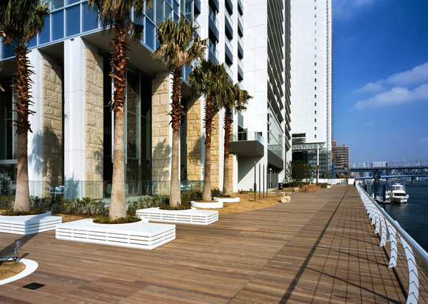 ・ワシントン椰子が植栽された運河沿いのテラス