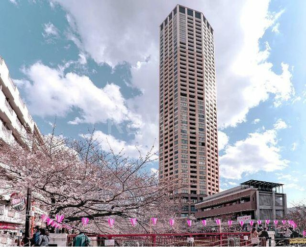東京メトロ日比谷線の始発で東急東横線の急行も停まる超人気駅「中目黒」駅の東口の大きな改札を出ると、右斜め前にそびえ立っているのがこちらのタワーマンションです。