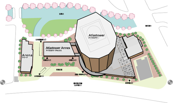 目黒川側には居住者用のメインエントランスや駐車場入口があり、ガラス貼りのロビーにあるソファーから桜並木を眺めながらお話しが出来る空間になっています。