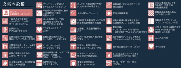 | 設備 | オートロック / カップル向け / 新婚さん向け / 仲介手数料無料 / 室内洗濯機置場 / 24時間換気システム / 照明器具付き / IHクッキングヒーター / コンロ2口以上 / システムキッチン / 対面式キッチン / バス・トイレ別 / 追焚機能浴室 / 浴室乾燥機 / 温水洗浄便座 / 独立洗面台 / エアコン / シューズボックス / インターネット無料 / TVモニタ付インターホン / 宅配ボックス / ディンプルキー | ||