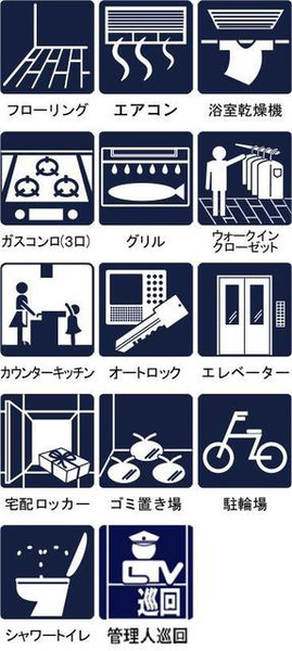 | 設備 | オートロック / 室内洗濯機置場 / バルコニー / 都市ガス / 敷地内ごみ置き場 / システムキッチン / バス・トイレ別 / 追焚機能浴室 / 浴室乾燥機 / 独立洗面台 / エアコン / ウォークインクロゼット / インターネット対応 / 宅配ボックス | ||