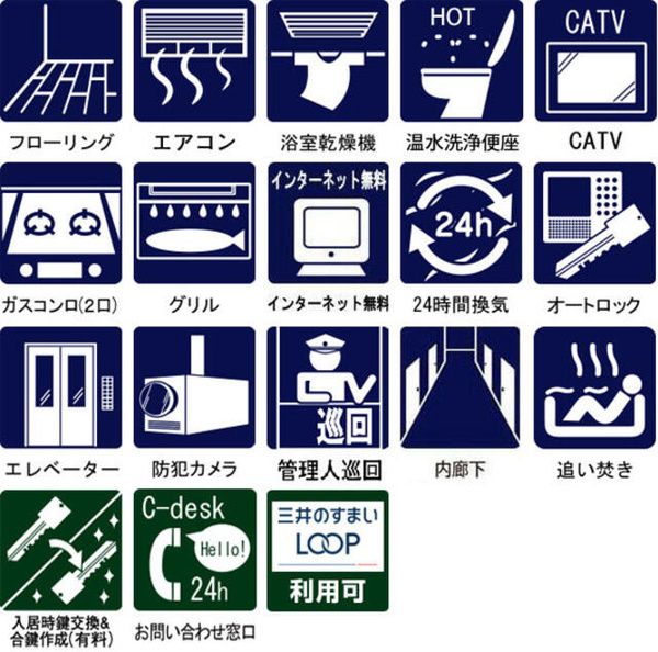 | 設備 | オートロック / カップル向け / 新婚さん向け / キャンペーン / 室内洗濯機置場 / バルコニー / 都市ガス / 敷地内ごみ置き場 / システムキッチン / バス・トイレ別 / 追焚機能浴室 / 浴室乾燥機 / 独立洗面台 / エアコン / 宅配ボックス | ||