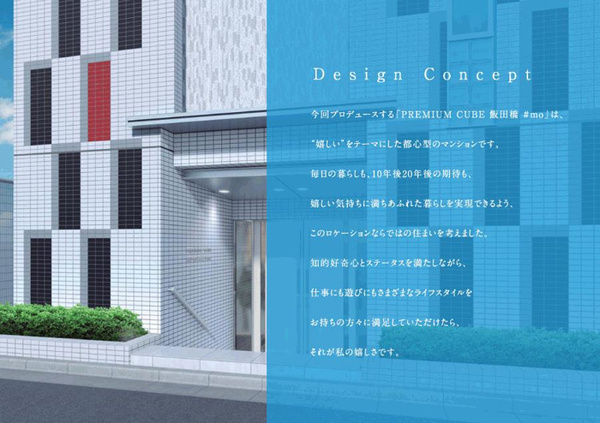 「今回プロデュースする【プレミアムキューブ飯田橋#mo】は、”嬉しい”をテーマにした都心型のマンションです。毎日の暮らしも、10年後20年後の期待も、嬉しい気持ちに満ちあふれた暮らしを実現できるよう、このロケーションならではの住まいを考えました。知的好奇心とステータスを満たしながら、仕事にも遊びにもさまざまなライフスタイルをお持ちの方々に満足していただけたら、それが私の嬉しさです。」
