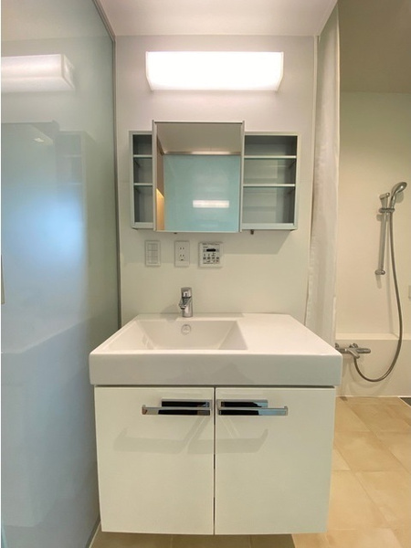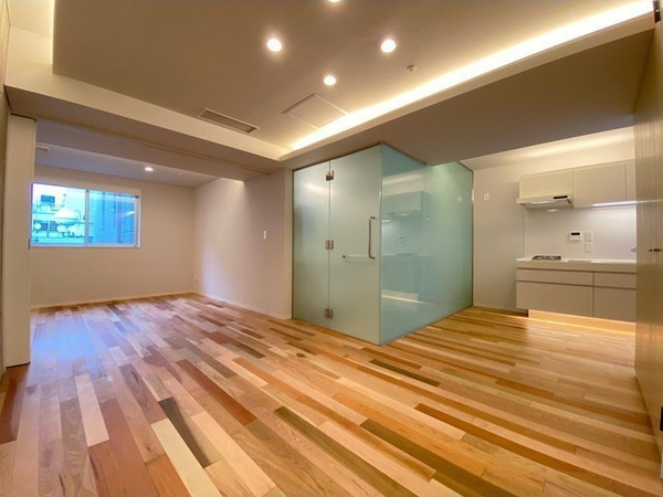 室内は、モザイク調の無垢フローリングや、ベージュのタイルが敷かれた白系のバスルームなど、おしゃれな空間のデザイナーズマンションになっています。