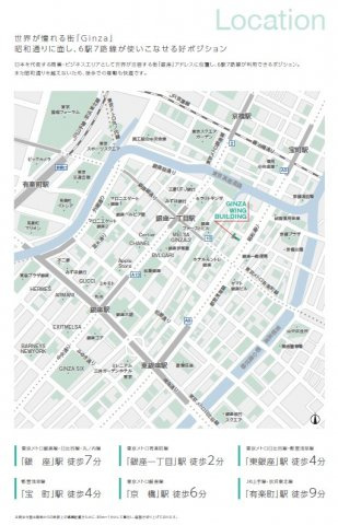 徒歩2分 都営浅草線 『宝町駅』 徒歩3分 都営浅草線 『東銀座駅』 徒歩4分 銀座線 『京橋駅』 徒歩6分 銀座線 『銀座駅』 徒歩7分 |
