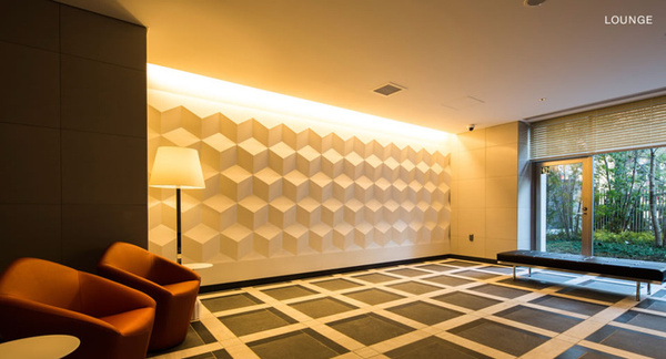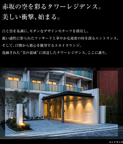 2015年度にグッドデザイン賞を受賞した建物で、2つのコンセプトを対比させる外観デザインとして、道路面はガラス手摺に金属マリオンの垂直要素を付加した端正なファサードとする一方、妻側面は三色のモノトーンで塗り分けた外壁パネルと開口部をランダムに配置した遊び心を感じさせるポップな構成とし、色彩を抑えることで赤坂の街並みに溶け込む建築物を実現したタワーマンションです。