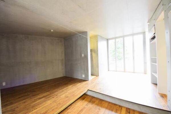 この2B号室は、約15帖のステップフロアの広い空間がウッドデッキまで広がるとても広い空間で、とても人気の高いタイプのお部屋です。