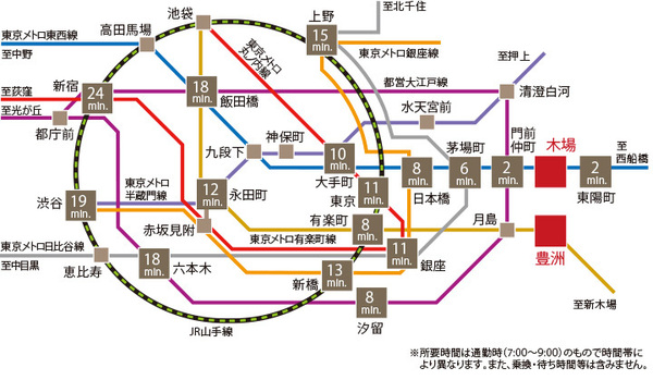 徒歩11分 有楽町線 『豊洲駅』 徒歩14分 東西線 『門前仲町駅』 徒歩18分 |